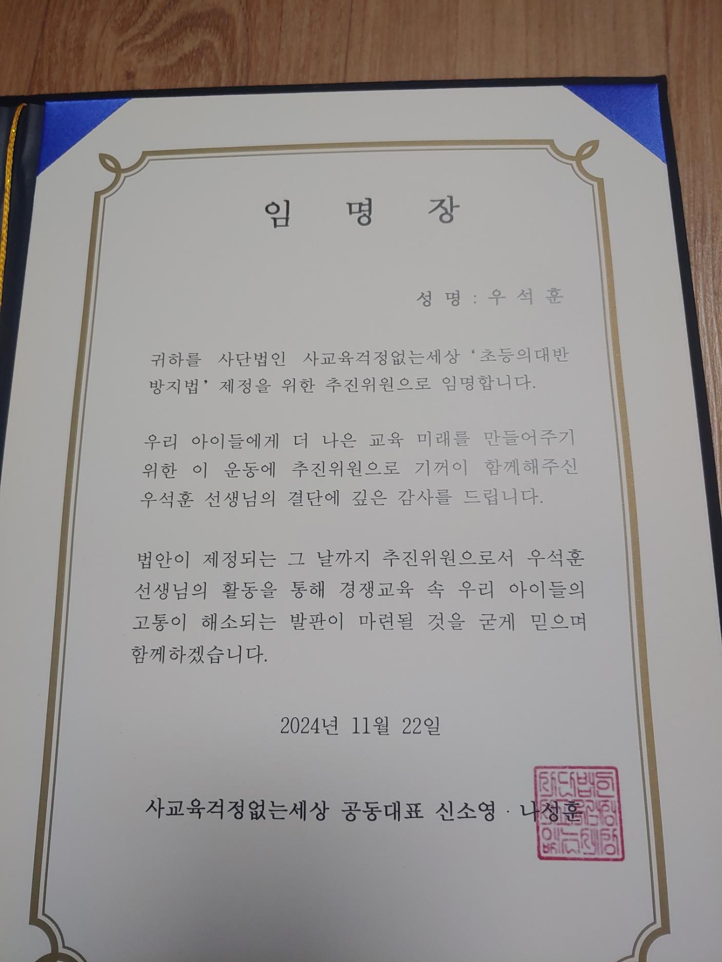 사교육걱정없는세상에서 하는 초등의대반 방지법 제정에 추진위원을 맡기로 했다. 시민단체 공식 직함은 우리 집 어린이들 태어난 뒤로는 처음이다..