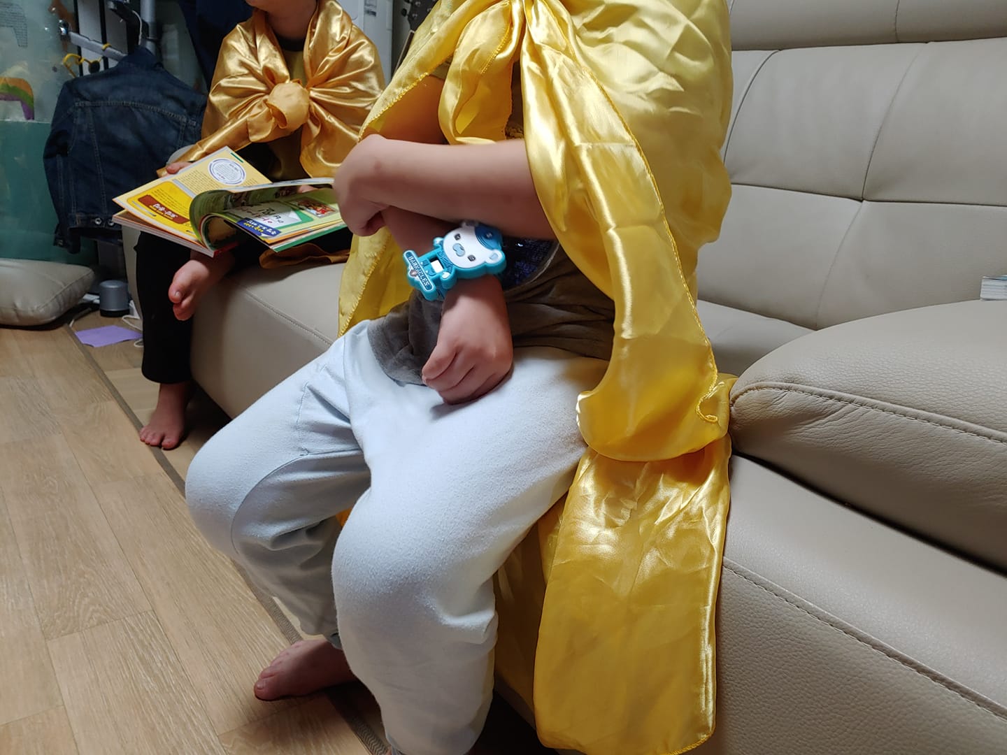 둘째가 망토하고 싶다고 해서 노란색 보자기 줬다. 큰 애는 유치하다고 하더니, 결국은 자기도 달란다.. 불타는 금요일, 아니고 황금 망토의 금요일. 난리 났다. 둘째는 오늘 어린이집도 보자기 뒤집어 쓰고 갔다.