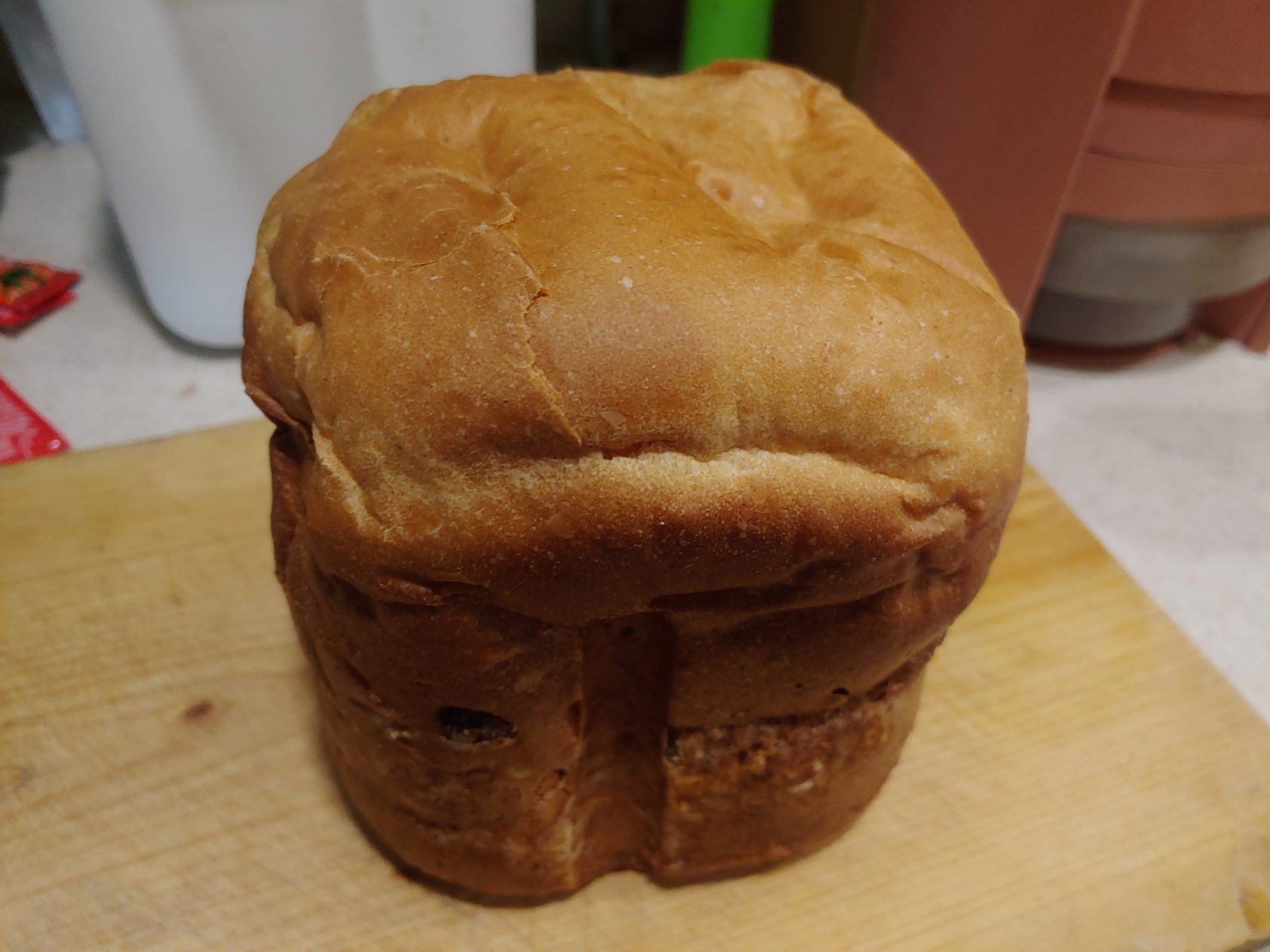 새로 산 제빵기로 구운 빵. 아직 새 제빵기 특성을 잘 모르기도 하고, 애들이 계란 하나씩 넣고 싶다고 해서 두 개를 넣었더니, 반죽이 약간 질게 된. 평소보다 조금 덜 부풀어 올랐다.